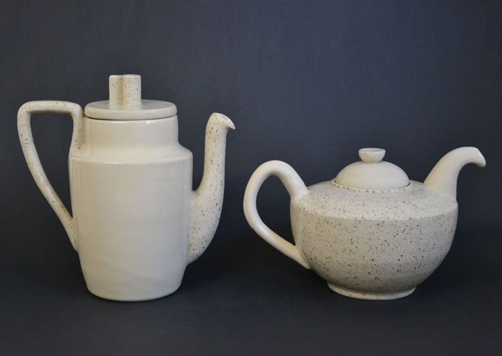 (rechts) Zwei-Ton-Kanne, Pyrit und weißer Ton kombiniert, H 15 cm, 1 Liter